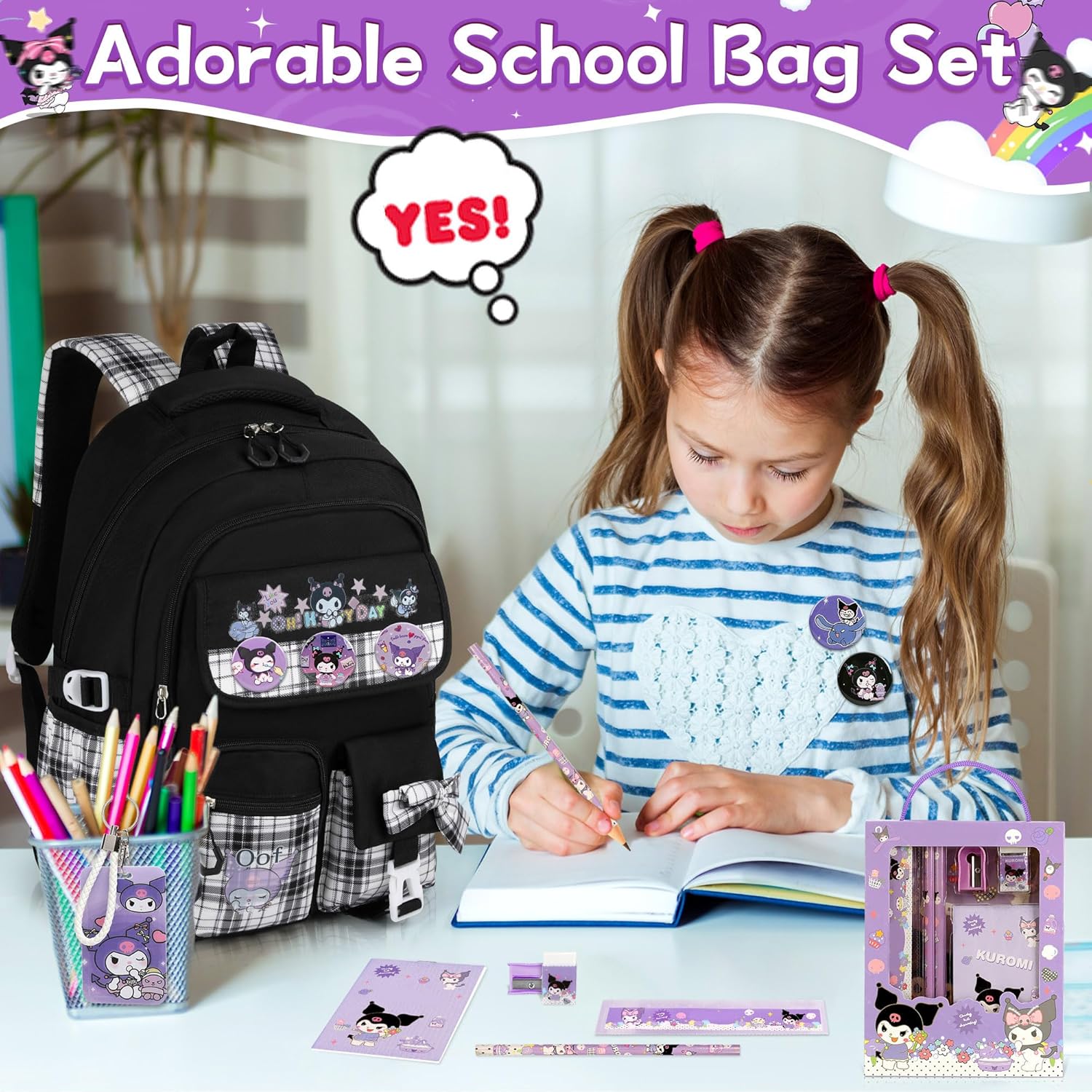 Full Cute College Bag Set:No must buy further equipment! Cute cartoon anime college backpack set contains 14 pcs:1 backpack,6 badge pendants,1 card holder,1 pencil sharpener,1 eraser,1 pocket book,2 pencils,1 ruler. Good for women who want a practical and classy backpack for varsity or journey