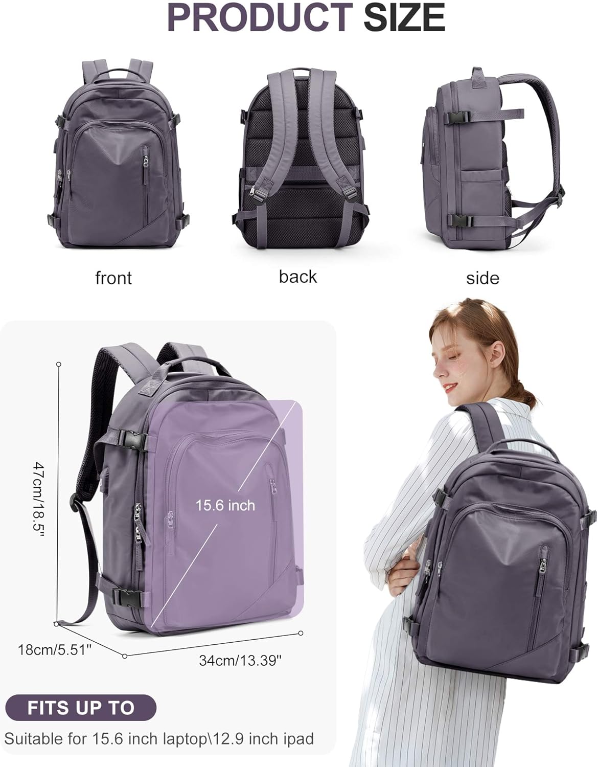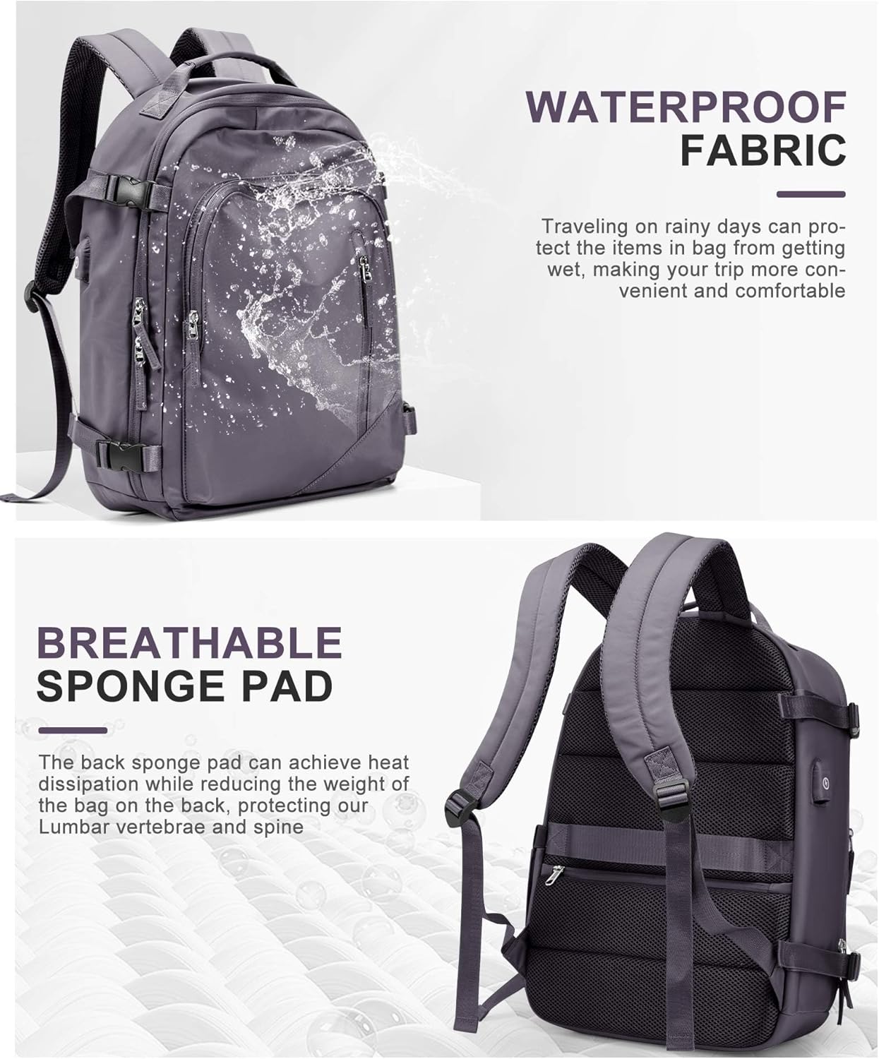 BJLFS Large Travel Backpack for Women Men,Carry On Backpack,Hiking Backpack Waterproof Outdoor Sports Rucksack Casual Work Gym Weekender Daypack Travel Essentials(simple, Purple)