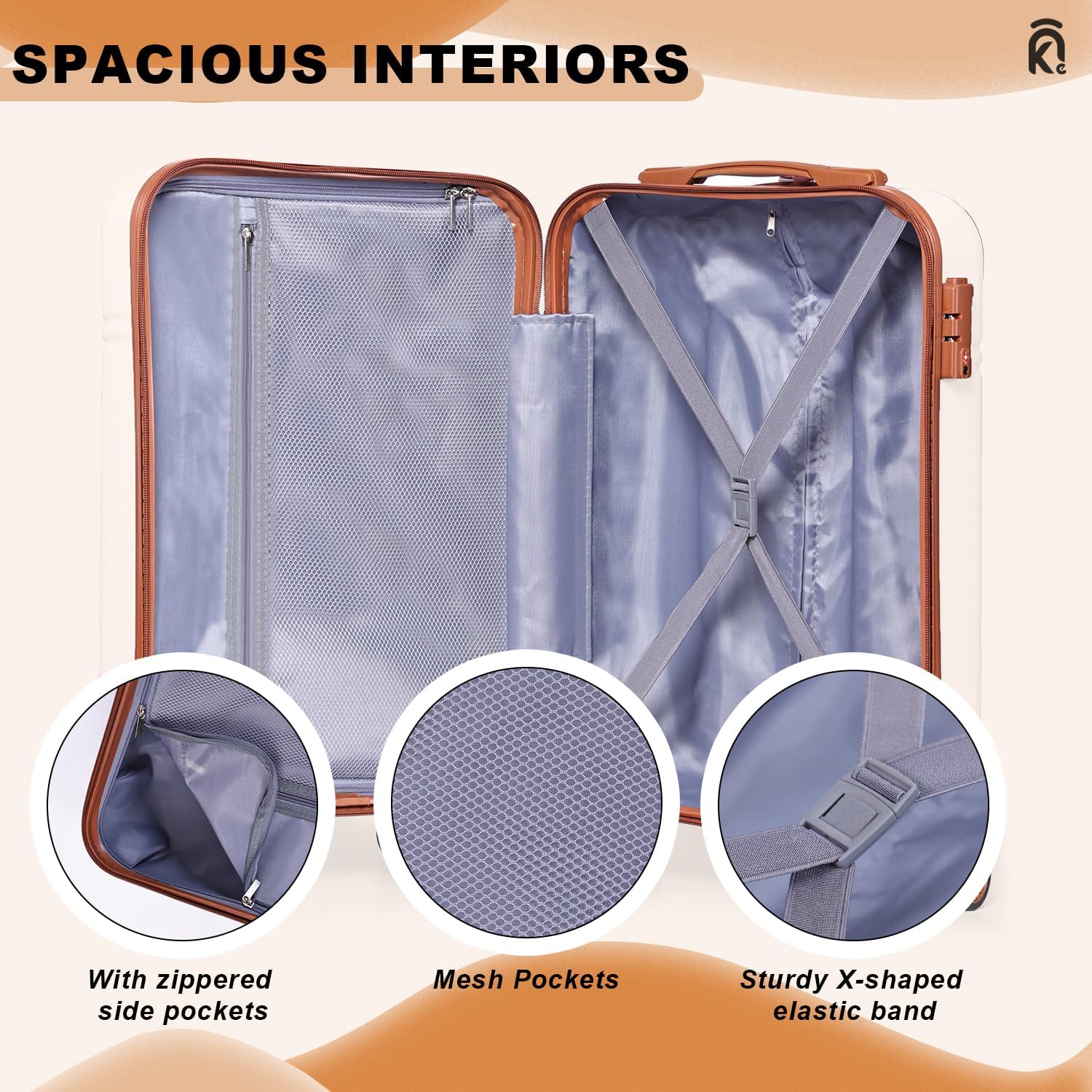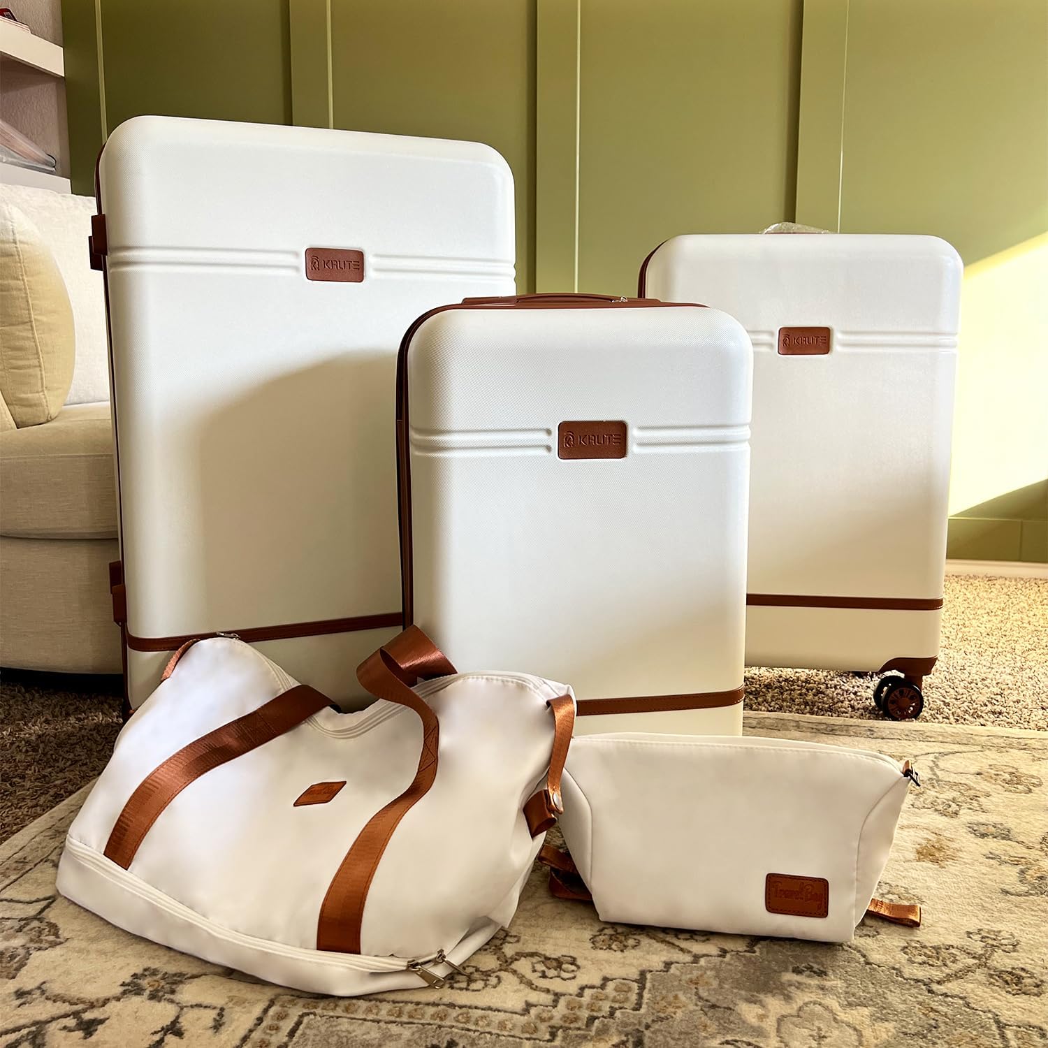 Krute Carry On Luggage Sets 3 Pieces Suitcase Set Hard Shell PC+ABS Airline Approved Suitcases with Spinner Wheels TSA Approved 20 Inch Luggage (WhiteBrown)